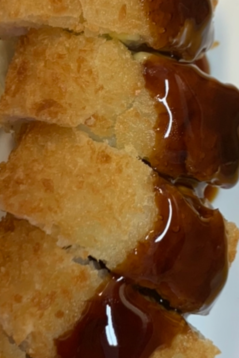 Fritert peking and med avokado, chilimajones og sesamfrø (gluten, egg)