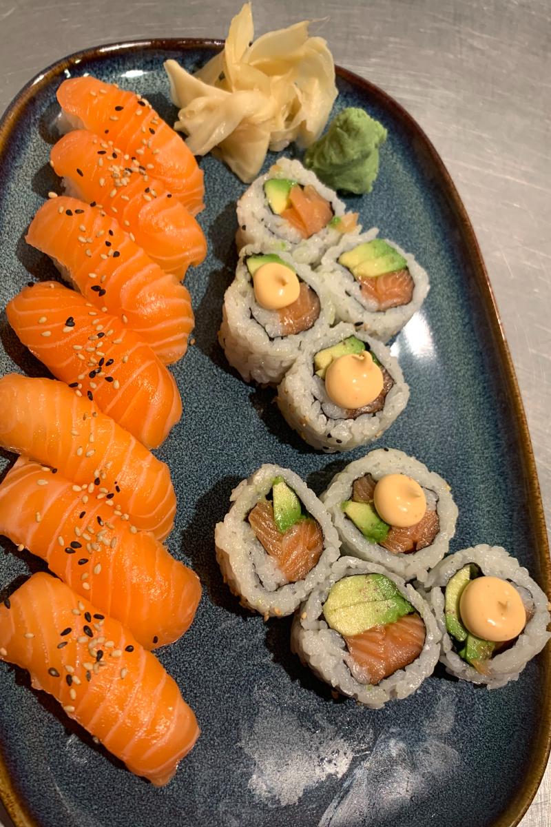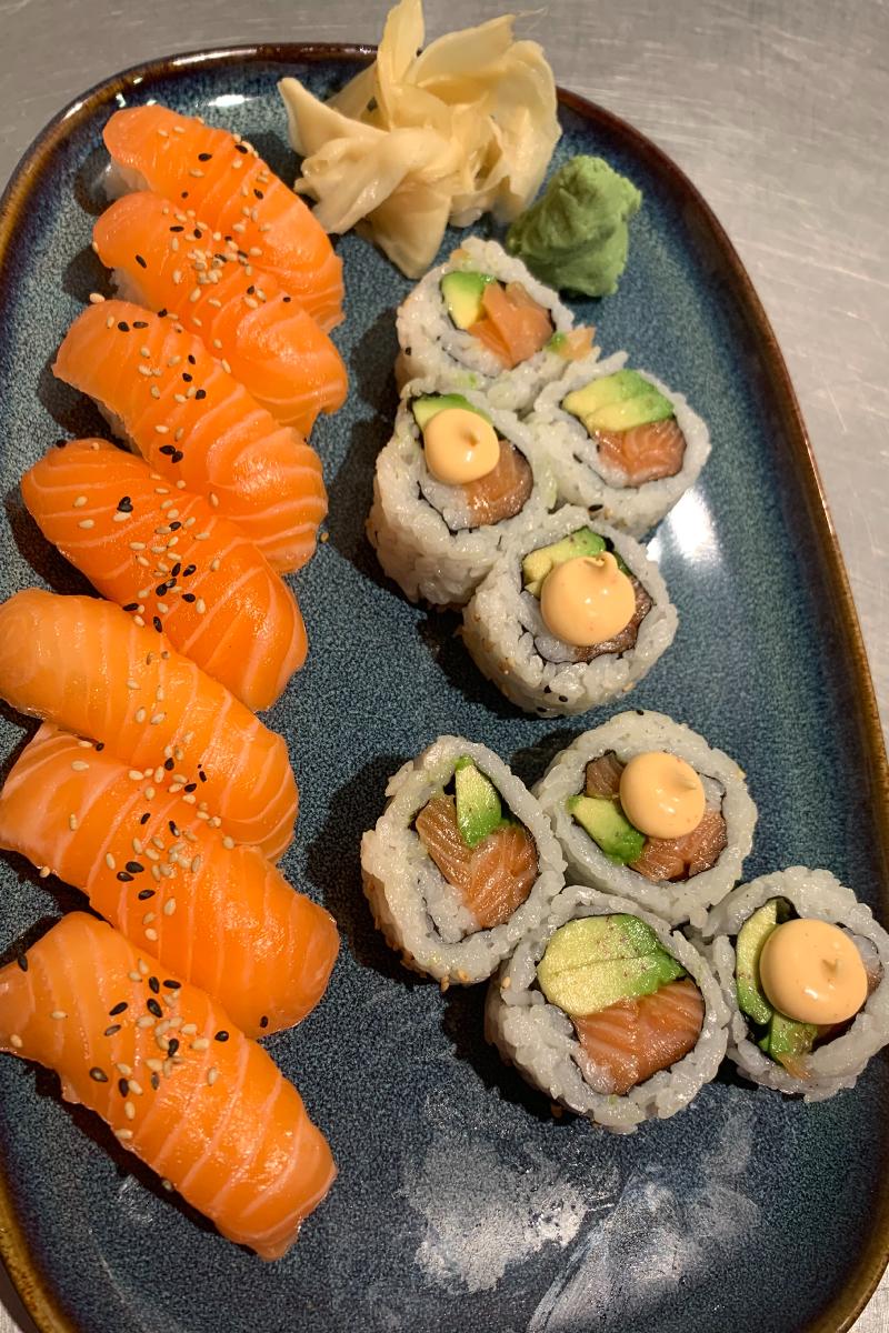 7 salmon nigiri ,4 salmon maki , og 4 salmon spicy maki.