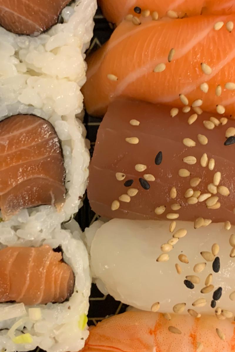 3 laks, 1 kveite, 1 tunfisk, 1 scampi og 4 laks maki (skalldyr,Sesamfrø)