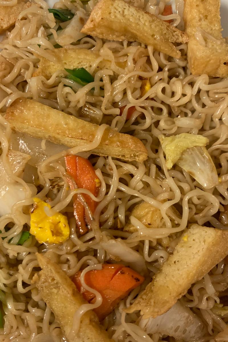 Fritert tofu med egg, nudler med en miks av grønnsaker (gluten)
