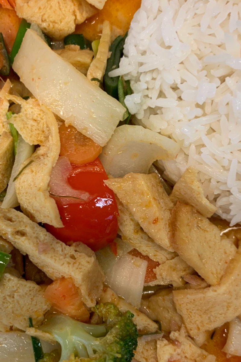 Fritert tofu med en miks av grønnsaker i gul karripasta og kokosmelk