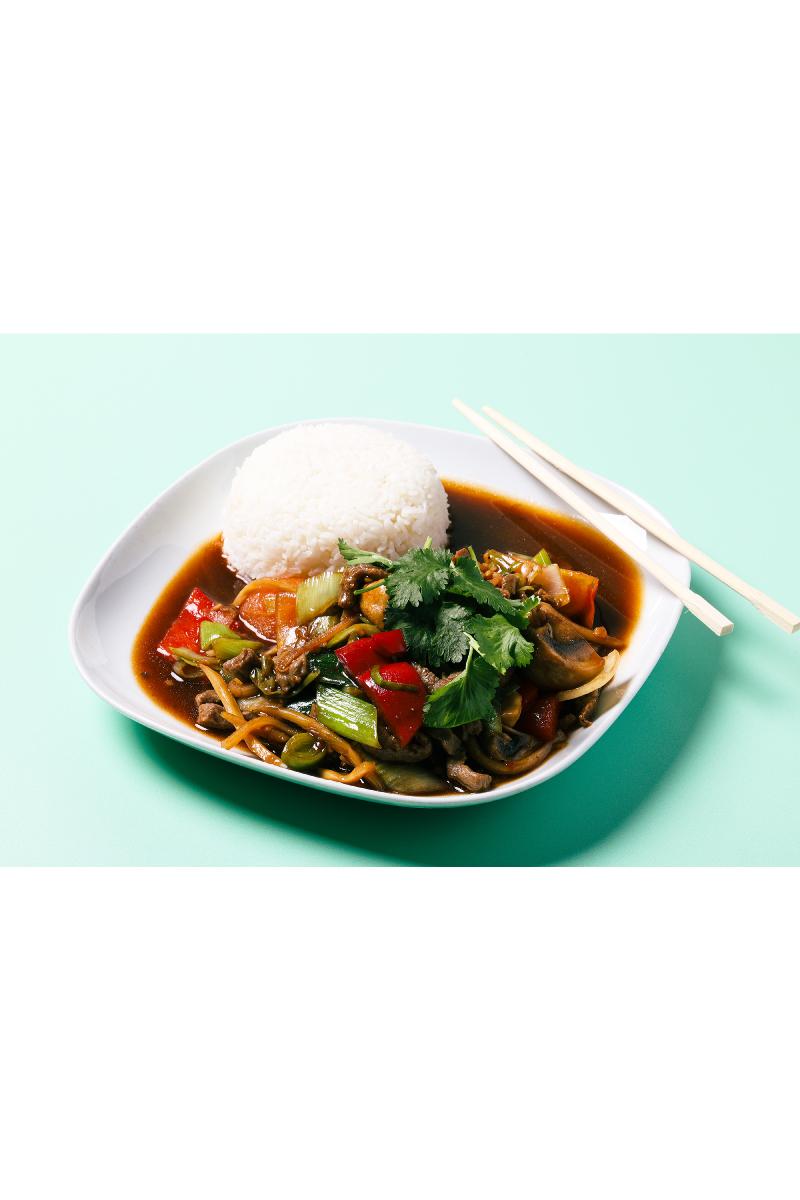 Fritert tofu, paprika, tomat, bambuskudd, chili, sopp, løk, hvitløk, koriander og ingefær (skalldyr, soya, gluten)