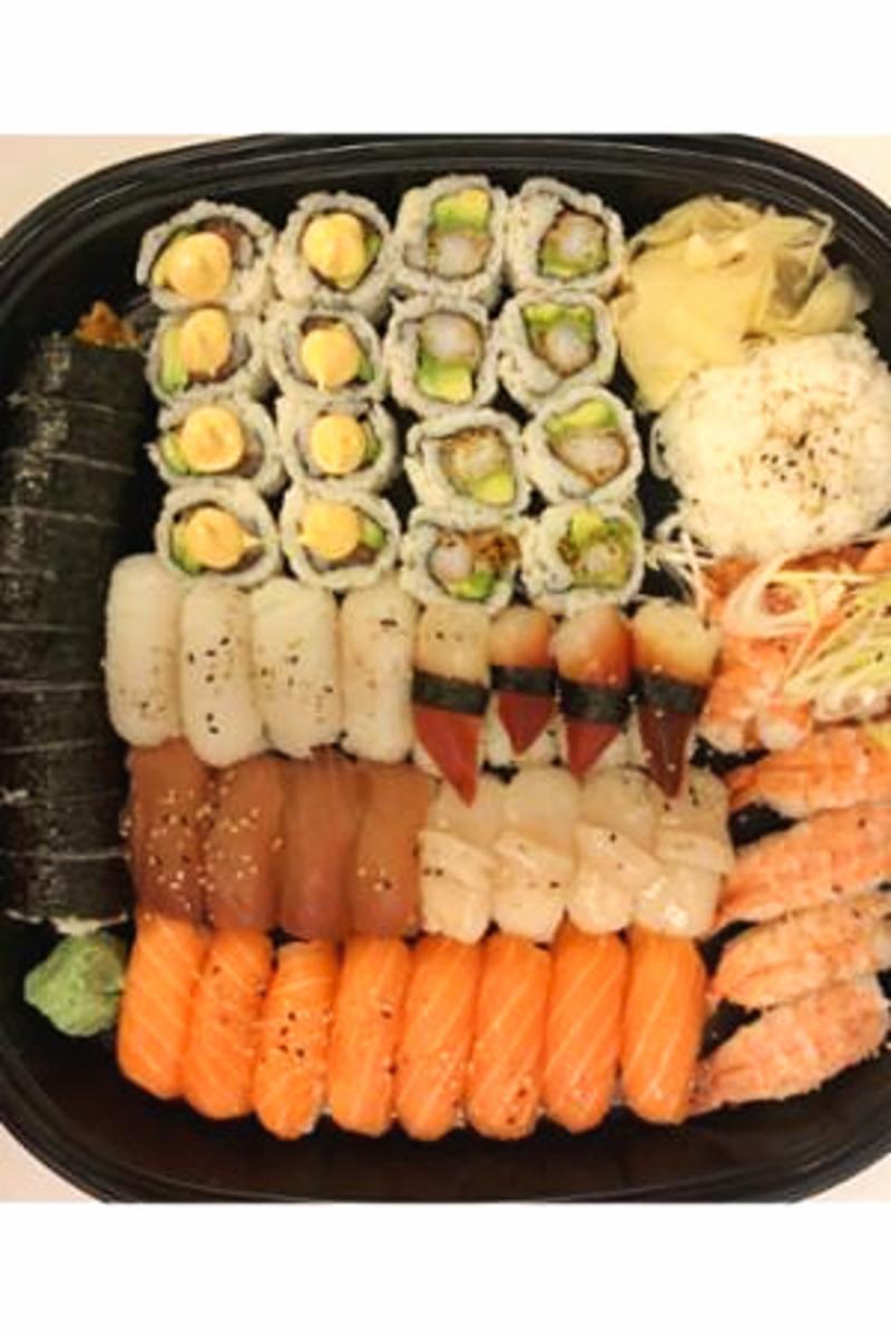 28 biter nigiri (12 laks, 4 kveite, 4 tunfisk, 4 scampi, 4 kamskjell) 8 biter sashimi (4 laks, 4 scampi) 26 biter maki (nr. 17A, nr. 17B og nr. 10B) (gluten, egg, skalldyr, sesamfrø)