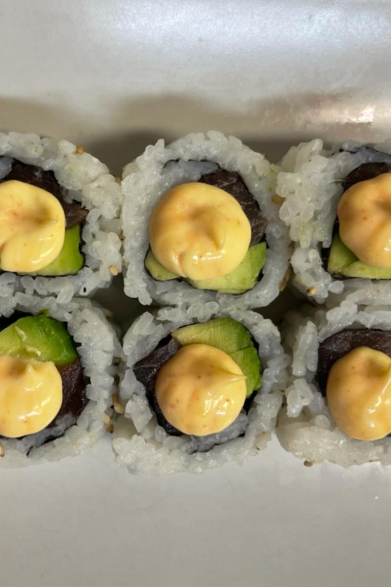 Tunfisk, avokado, toppet med chilimajones, sesamfrø (egg)
