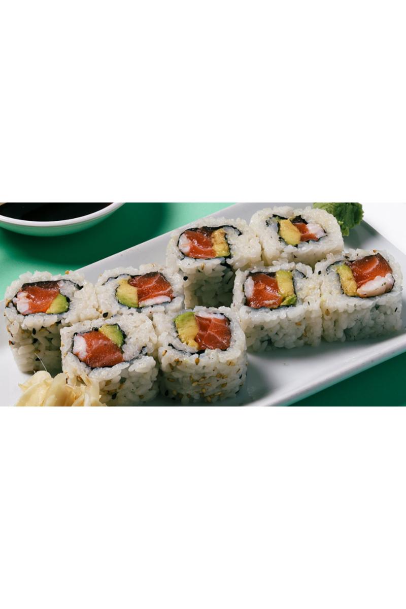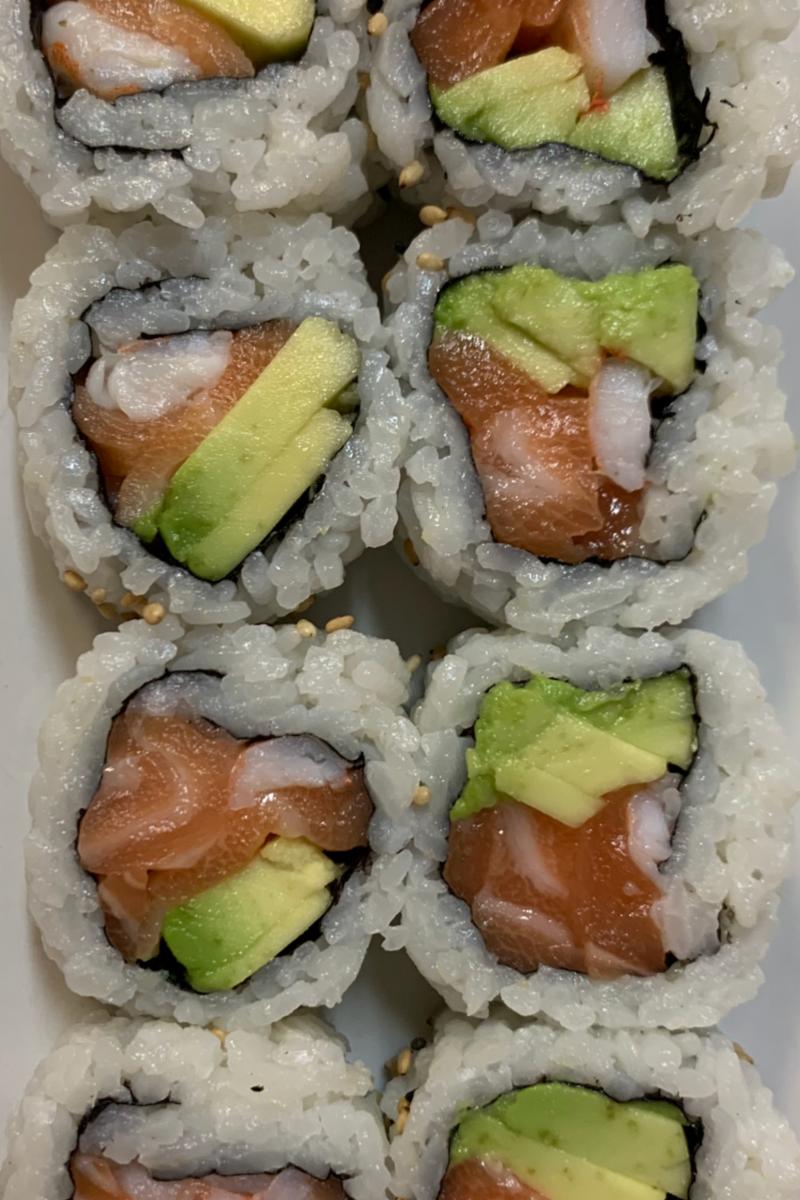 Laks, kokt scampi, avokado, sesamfrø (Skalldyr).