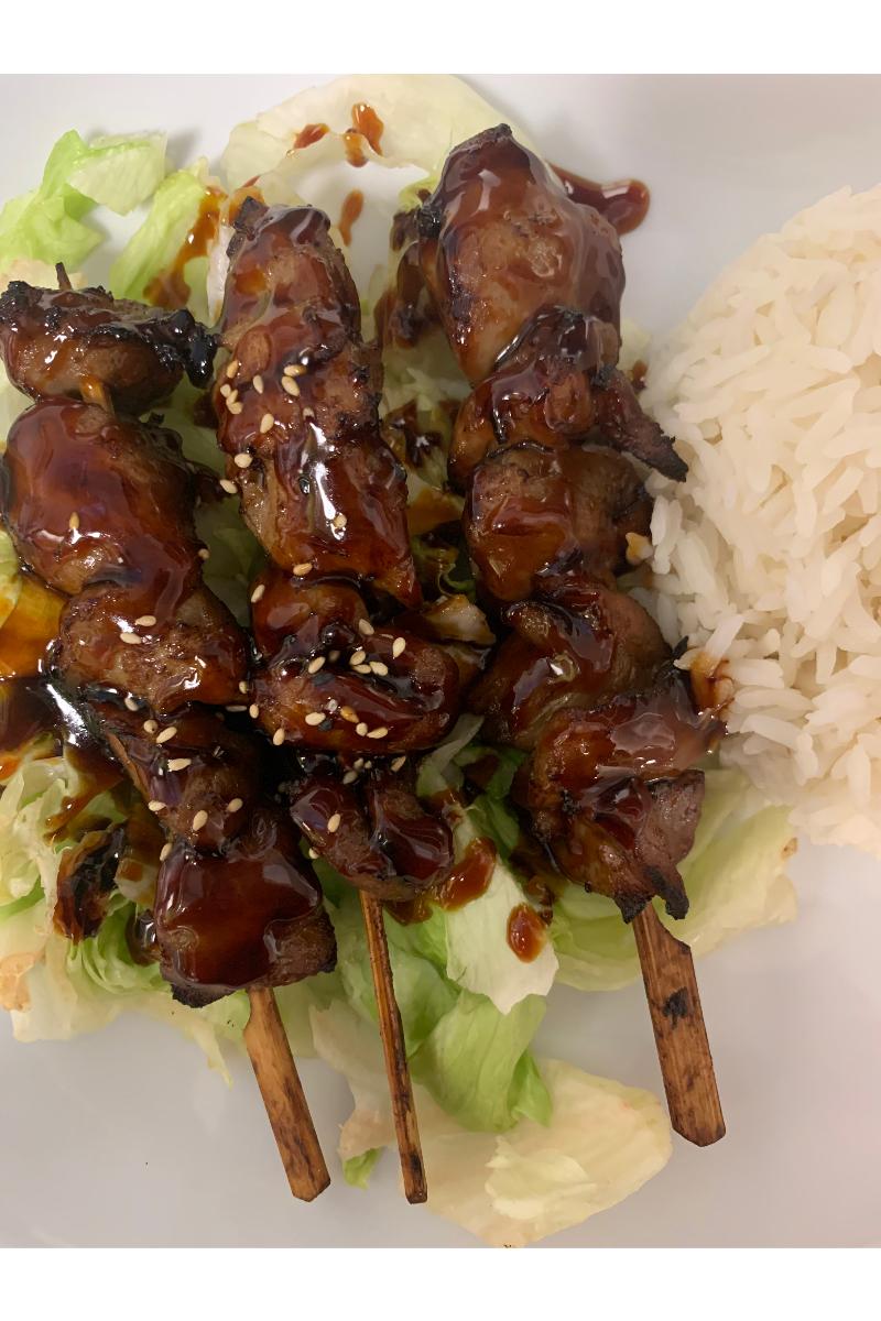 Grillet kylling spyd, husetssaus, sesamfrø, salat, ris (gluten)