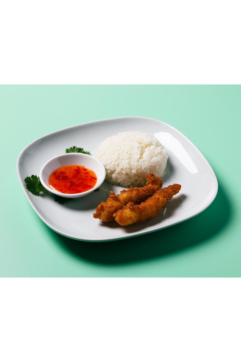 2stk. fritert scampi med ris, sweet chilisaus og soyasaus (skalldyr, gluten)