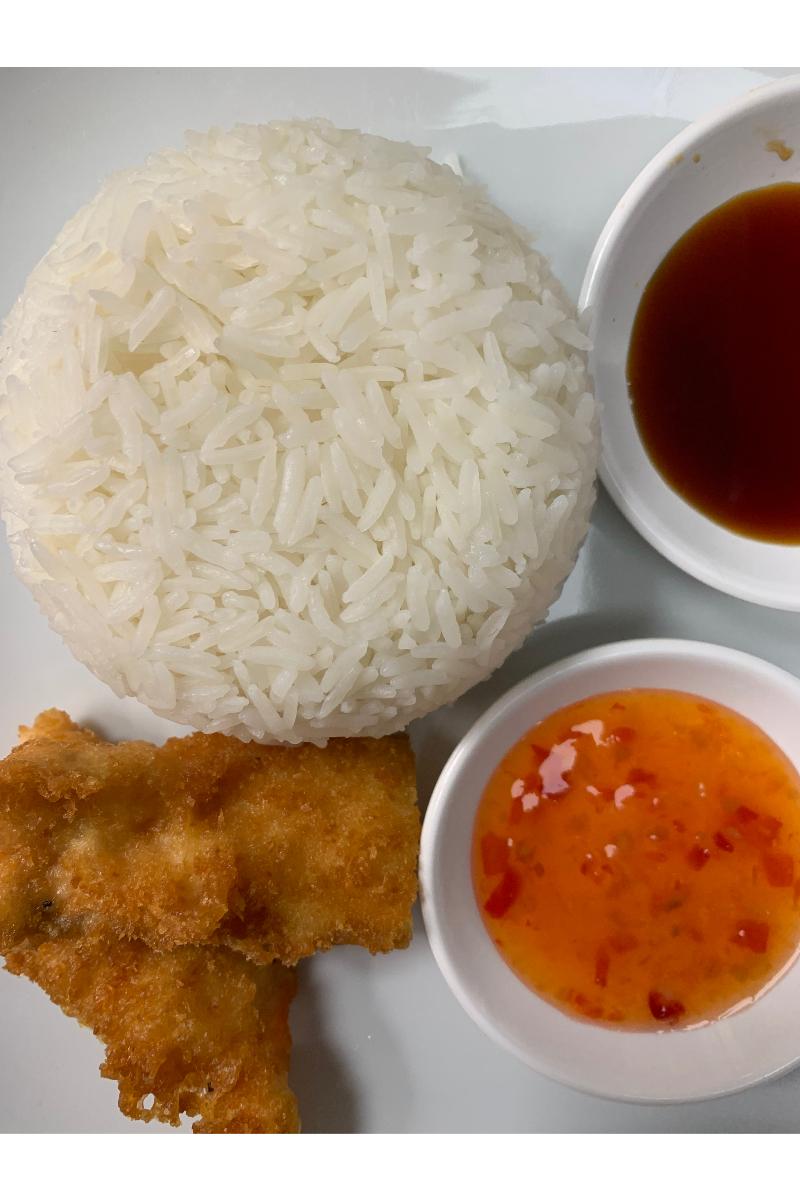 5stk. tempura laks med ris, sweet chilisaus og soyasaus (gluten)