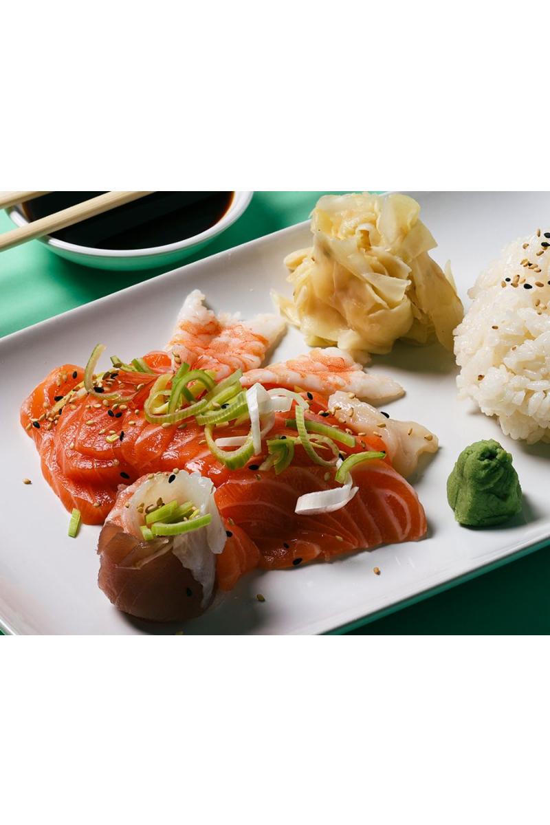 5 laks, 2 kveite, 1 tunfisk, 1 scampi, 1 kamskjell (skalldyr, bløtdyr, sesamfrø)